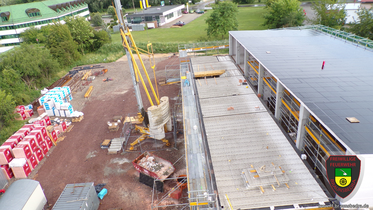 Sehr geehrte Bürgerinnen und Bürger, liebe Sponsoren und Freunde, heute möchten wir Ihnen wie versprochen über die neuesten Fortschritte zum Anbau an unser Gerätehaus berichten. Im Laufe des Aprils ist das komplette Fundament mit den enthaltenen Abwasserleitungen fertig gestellt wurden. Darauf wurden mit Hilfe eines Krans 22 Betonstützen gestellt. Auf den Stützen wurden die Dachfetten angebracht. Im Mai ist die komplette Dachkonstruktion fertig gestellt wurden. Die Wände zur Abgrenzung der einzelnen Fahrzeughallen wurden hochgezogen und somit das Grundgerüst des Gebäudes fertiggestellt. Mit Beginn des Junis wurden die Installations- und Kabelschächte angelegt, sowie die elektrischen Leitungen verlegt. Das Dach wurde mit einer Spezialfolie versiegelt. In den letzten Wochen wurden die Wände der ersten Etage des Sozialtraktes fertig gestellt, die Vorarbeiten für [...]