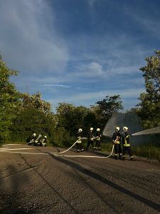 Dazu legt sie viele Schläuche hintereinander und setzt mehrere Pumpen dazwischen, damit das Wasser mit genug Druck bis zur Einsatzstelle kommt und das Feuer gelöscht werden kann.